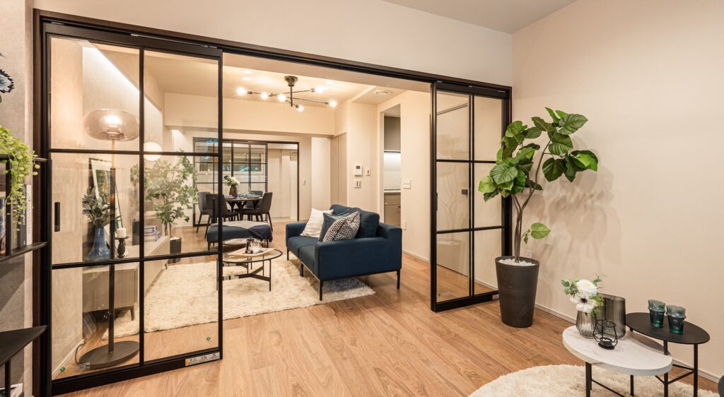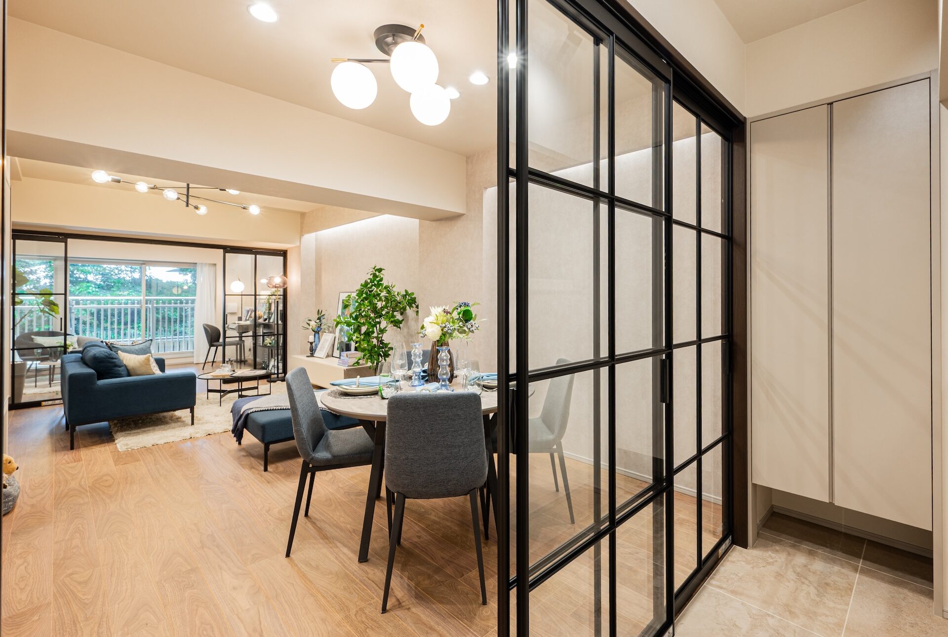 こちらの物件の最大の特徴は、洋室とLDKの間にガラス引き戸を採用した可変性のある間取りです。ガラス戸を閉じれば個室として、開放すれば広いLDKとして。ライフスタイルに応じて空間を自由に使い分けられる設計になっています。
