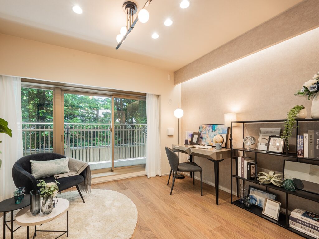 玄関側の空間をダイニング、キッチン横の広い空間をリビングとして設えることで、ソファまわりにゆったりとした余裕が生まれ、寛ぎや安らぎをより感じられるリビングを演出しています。また、部屋の奥に向かって家具の高さが下がっていき、窓方向への視線を遮らないことで、「緑と光を奥まで届ける設計」という物件の本質的な魅力が、入室した方の目に自然と飛び込んでくるような構成となっています。