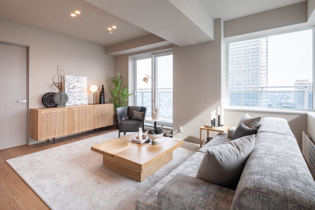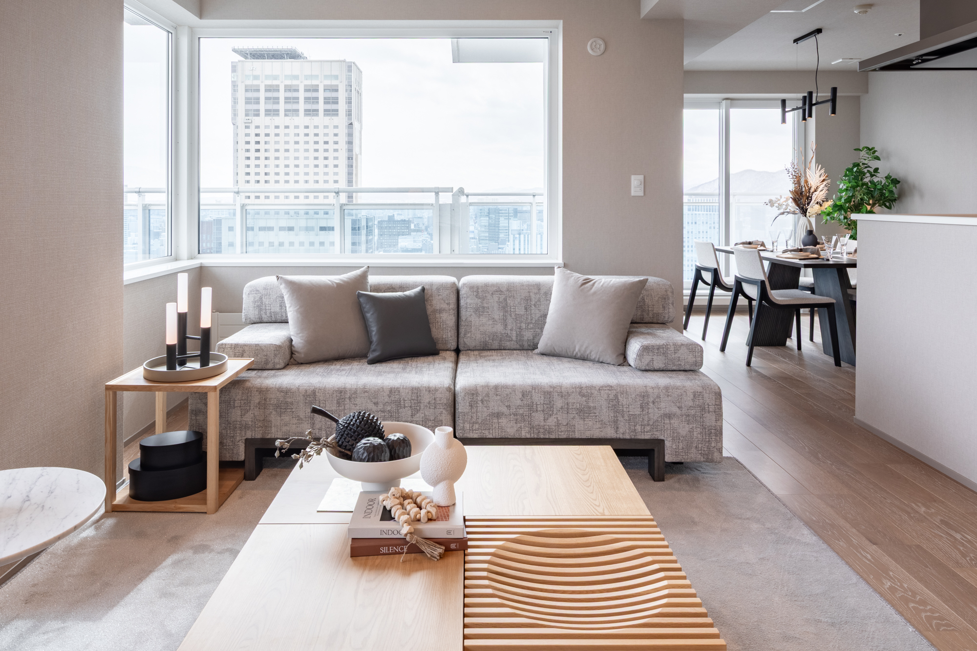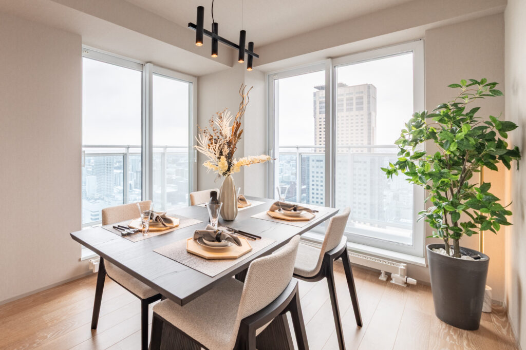 物件は、都市の街並みと美しい山景色を同時に望むことができる、札幌駅至近のタワーマンション高層階。リビングとダイニングが、やや独立したようなレイアウトが特徴です。