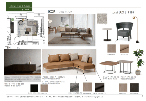 北海道産材の魅力を発信する木製家具メーカー「カンディハウス」にご協力いただいて、方向性の異なる2つのインテリアプランをご提案しました。