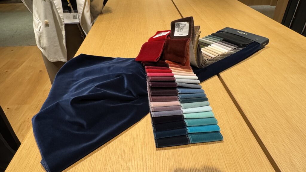 ソファ等の生地サンプルもたくさん展示されていて、上質なコットン製のベルベット生地を広げて見せていただきました。豊富なカラバリから選べるとのこと。